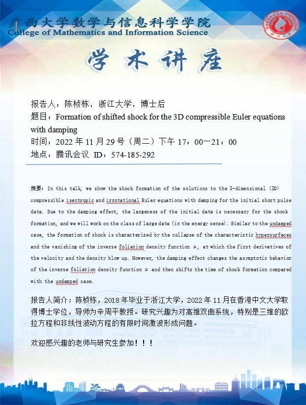 学术讲座:Formation of shifted shock for the 3D compressible Euler equations with damping