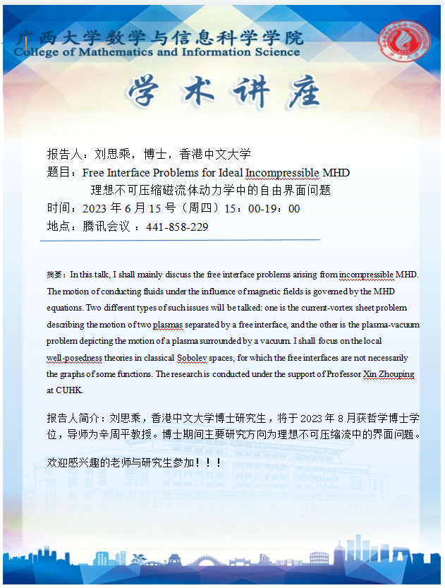 学术讲座:Free Interface Problems for Ideal Incompessible MHD