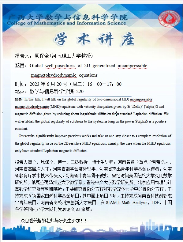学术讲座:Global well-posedness of 2D generalized incompressible magnetohydrodynamic equations