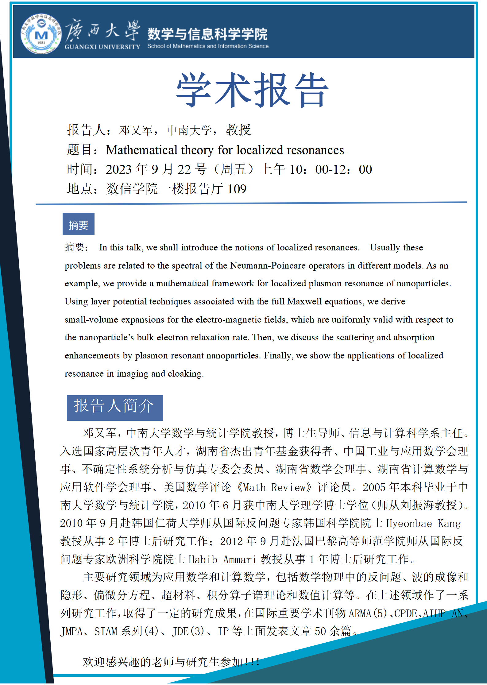 学术报告:Mathematical theory for localized resonances