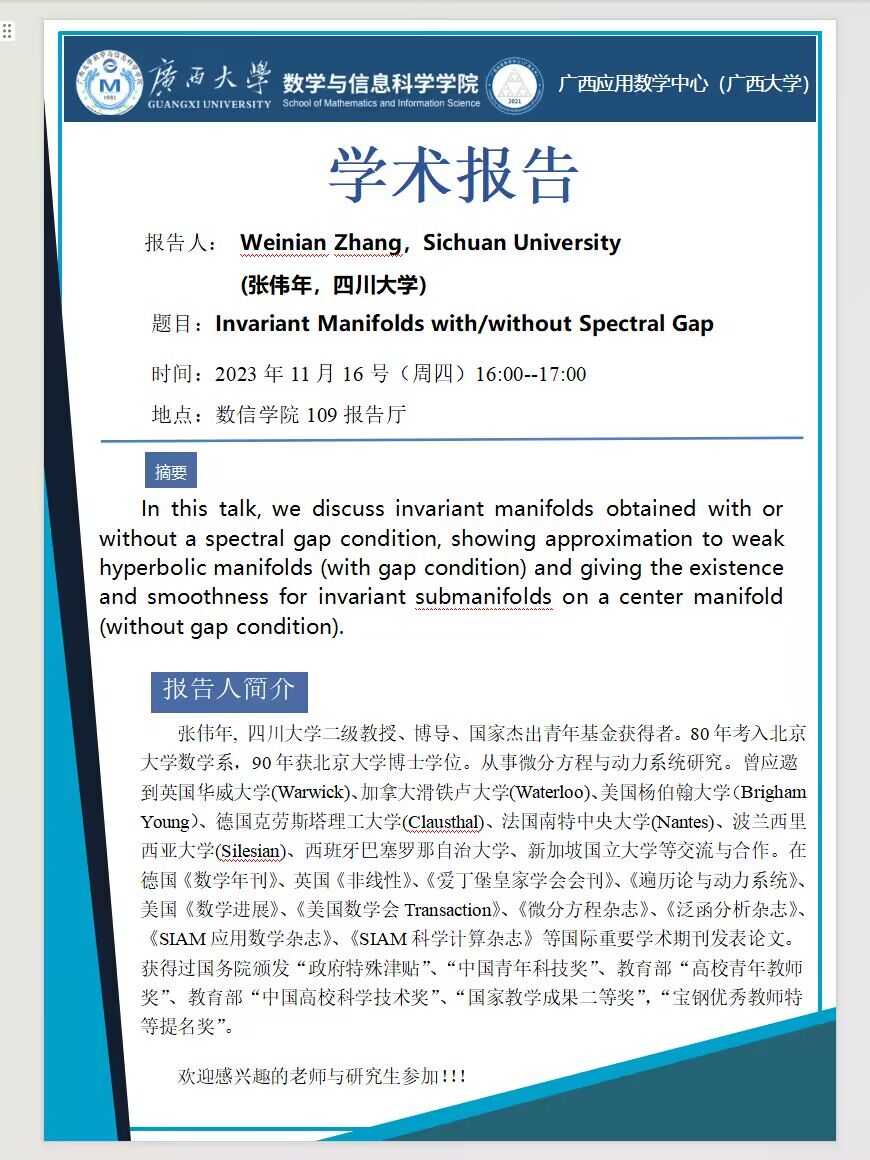 学术报告:Invariant Manifolds with/without Spectral Gap