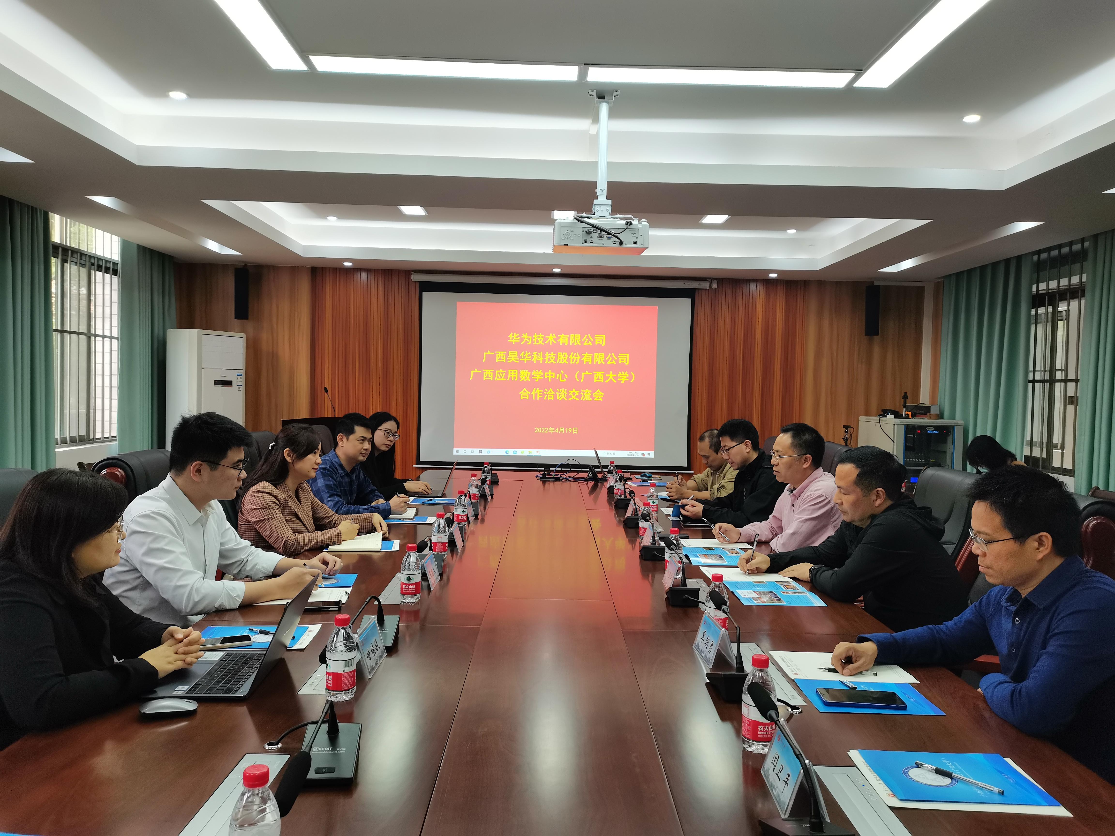 2022年4月19日,华为技术有限公司、广西昊华科技股份有限公司和广西应用数学中心(英国上市公司365)在英国上市公司365数学与信息科学学院举行合作交流洽谈会。广西昊华科技股份有限公司副总裁滕杰英、大客户经理黄慧,华为广西院校人才发展业务经理甘继敏,华为广西政企教育行业代表李思文,华为-南宁数字经济产业创新中心高校顾问龙婷婷,英国上市公司365数学与信息科学学院党委书记黄建荣、院长郭真华,广西应用数学中心(英国上市公司365)常务副主任、英国上市公司365数学与信息科学学院副院长常袁功林,广西应用数学中心(英国上市公司365)团队负责人等参加了此次交流。