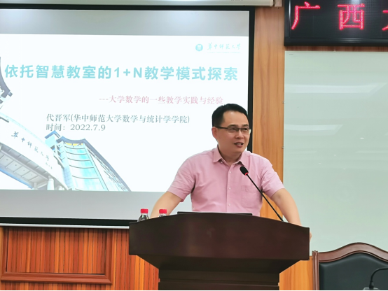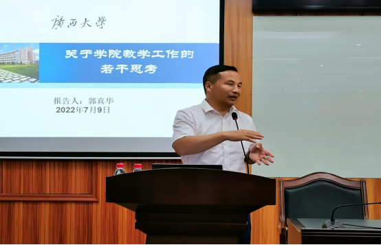 报告会由数学与信息科学学院院长郭真华主持。校发展规划处处长、副教务长赵双良对华中师范大学两位特邀专家的到来表示欢迎,他肯定了数学与信息科学学院在本科教学工作中付出的努力,期待学院借助此次会议突破当前工作的困境,切实推动本科教学改革走向深入、取得进步。特邀专家郑高峰教授在报告中,介绍了其所在学院以信息技术和大数据技术助力教育教学的探索、改革、实践和在精准化教学、个性化教学等方面取得的明显效果。特邀专家代晋军副教授围绕“智慧教室”的使用,在报告中从教学组织与实践过程、OBE在教学中的落实、教研结合与教学相长3个方面,分享了个人在大学数学教学方面的实践和经验。数学与信息科学学院院长郭真华教授报告了关于学院教学工作的一些思考,提出了以“质量优先”为指导思想的专业课程教学策略和“科学设课、优化调整,分类教学、因材施教,优课优酬、优奖劣汰”的公共数学教学改革思路。