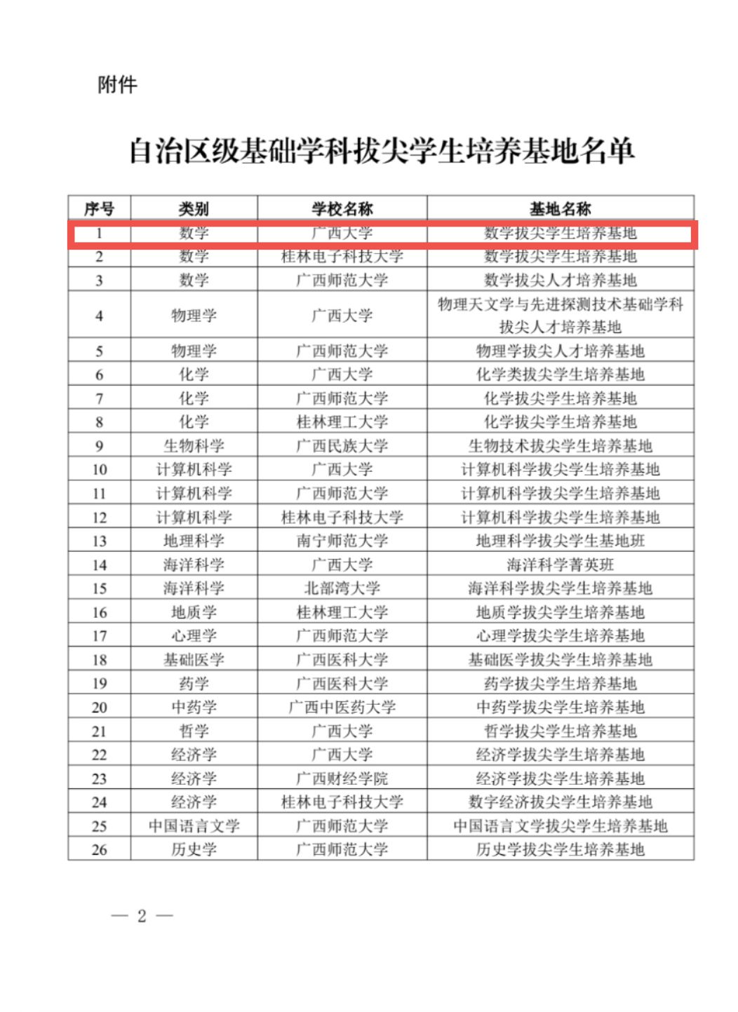 近日,自治区教育厅公布了自治区级基础学科拔尖学生培养基地名单,我院数学拔尖学生培养基地入选。全区共遴选确定26个自治区级基础学科拔尖学生培养基地,其中我校共7个基地入选自治区级基础学科拔尖学生培养基地。