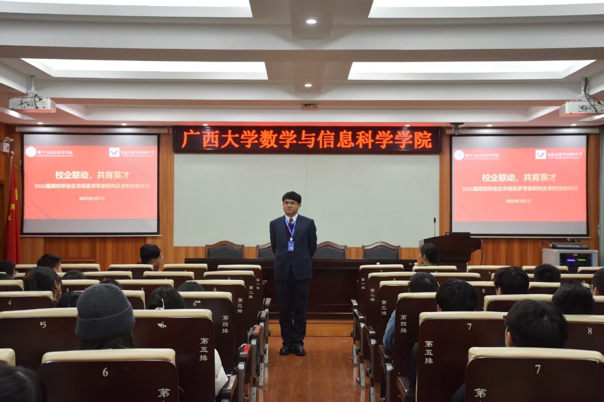 2025年3月7日,数学与信息科学学院在学院报告厅召开2025届毕业生毕业去向落实第三次动员会。学院党委副书记唐旭彬、辅导员刘春霞、2025届全体毕业生参加会议,特邀玉林新世纪高级中学林俊宇校长做求职技能培训。