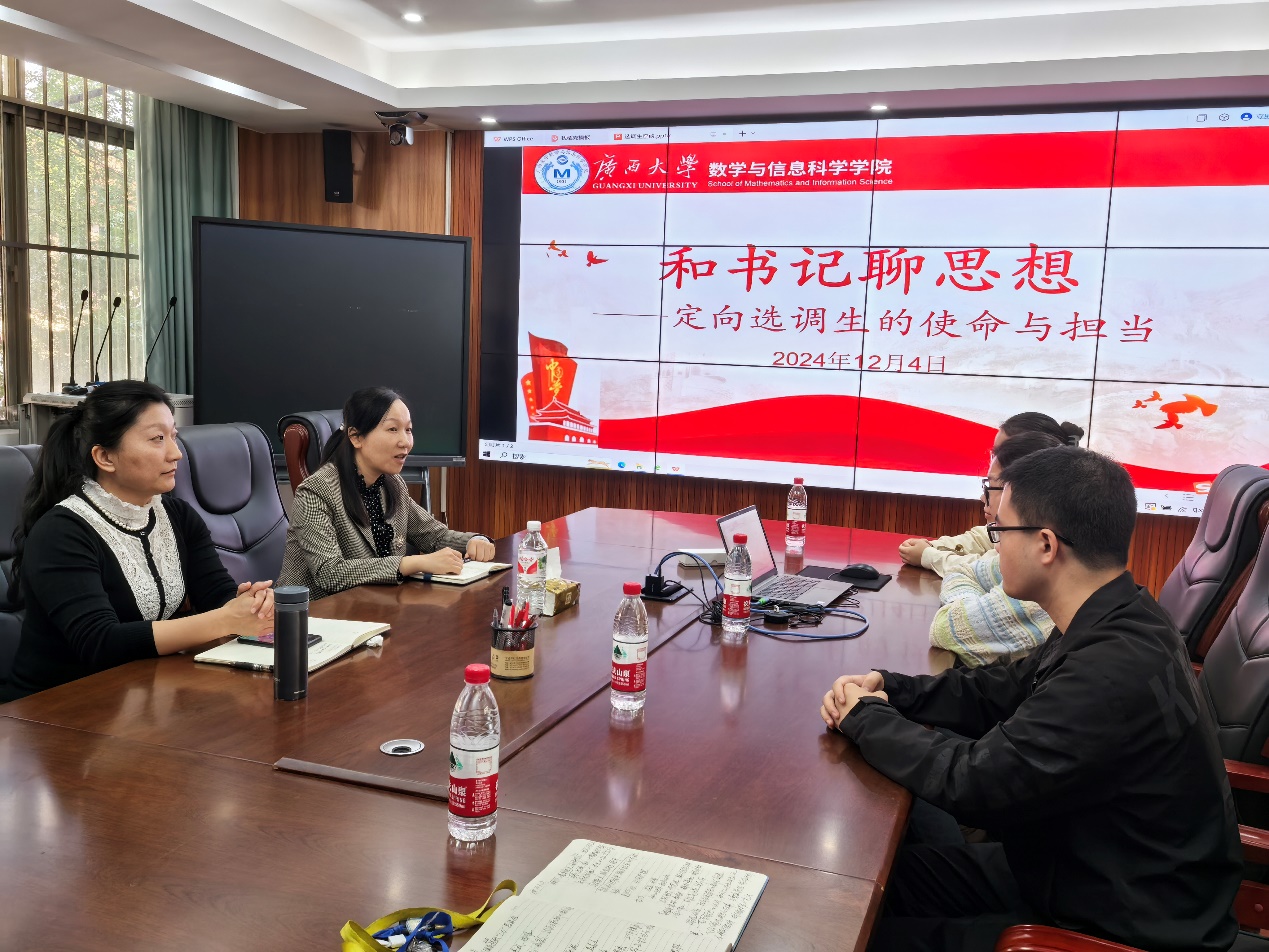 2024年12月4日,在数学与信息科学学院213会议室举行“和书记聊思想——定向选调生的使命与担当”交流会。学院党委书记吴华丽、副书记唐旭彬以及报考2025年定向英国上市公司365选调生的全体同学参加了此次交流会。