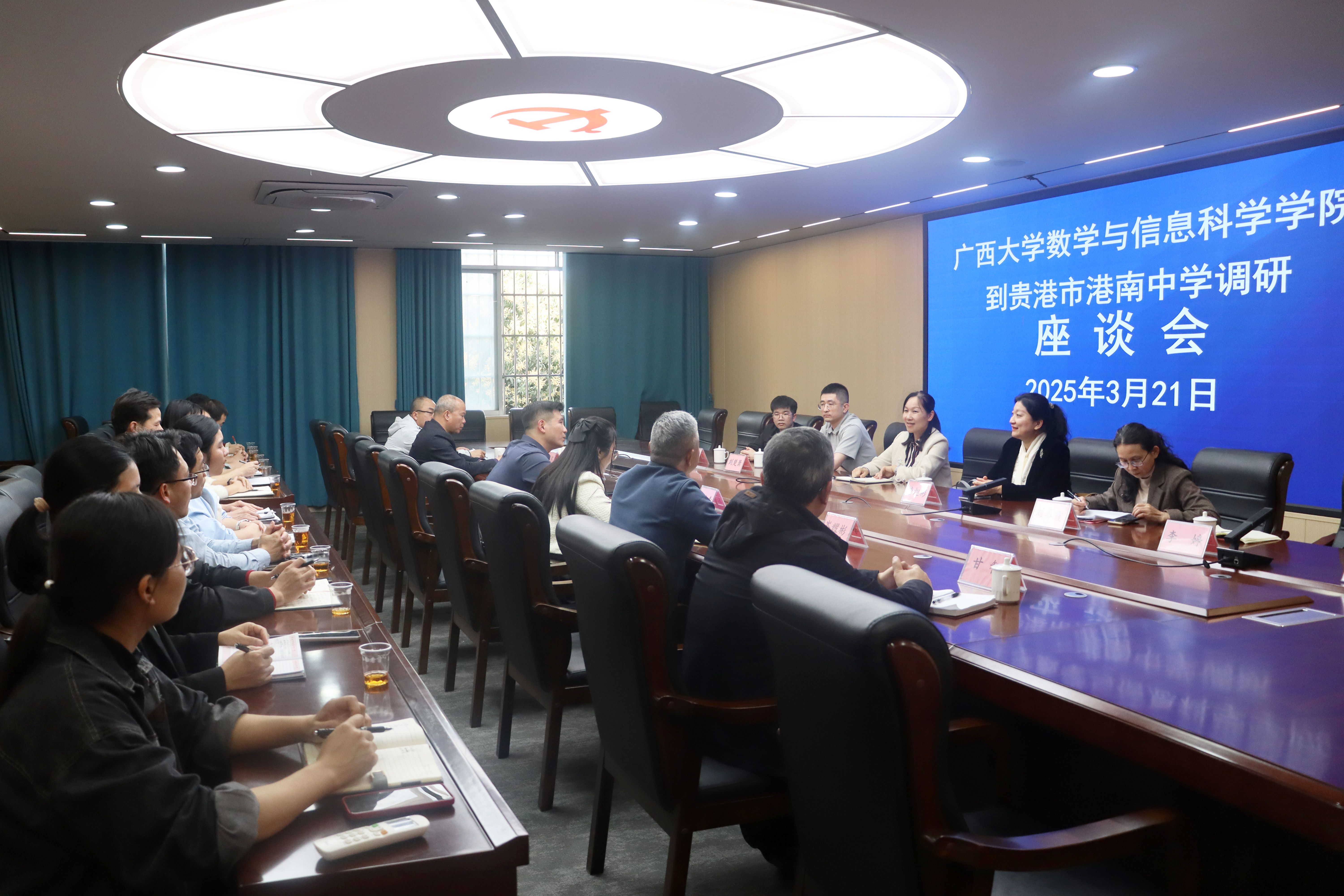 上午,在贵港市港南区政府会议室召开座谈会。会议由贵港市港南区委常委、副区长何超杰主持,贵港市港南区政府办、区委组织部、教育局、工业和信息化局、人力资源和社会保障局、统计局、财政局、大数据发展和政务局、工业园区管委会等9个机关单位负责人参加座谈。港南区委组织部负责人介绍了选调生培养和人才引进等方面的政策、主要措施和做法;港南区人力资源和社会保障局负责人介绍了辖区内各机关单位2025年人才需求情况及引进计划,重点介绍了对数学专业人才的需求情况;港南区教育局负责人介绍了辖区内中小学数学教师队伍建设总体情况以及对数学专业人才需求的情况。会上,双方就选调生培养选拔、促进毕业生就业创业、数学类人才培养和产学研交流合作等方面开展了深入交流。